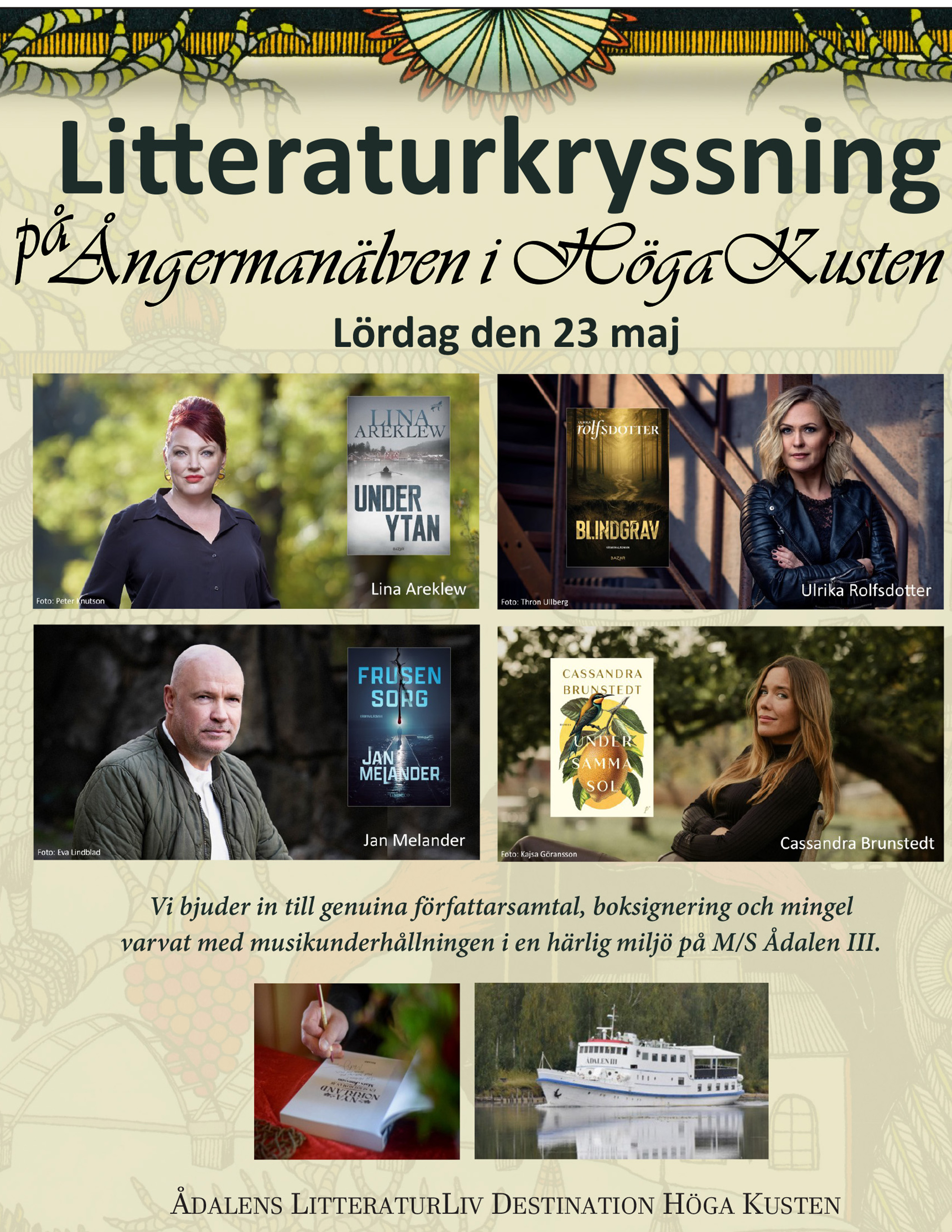 Följ med oss på en härlig och bekväm dagsresa från Umeå till Kramfors, där Ådalens Litteraturliv Destination Höga Kusten bjuder in till genuina författarsamtal, boksignering och mingel varvat med musikunderhållningen i en härlig miljö på M/S Ådalen.